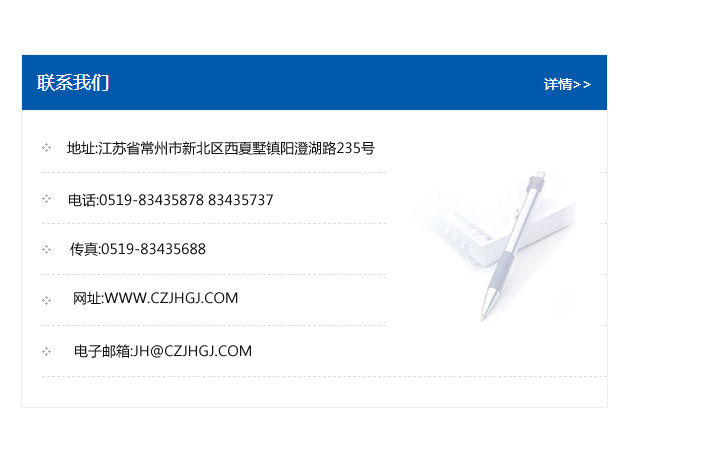 地址:常州市新北區友邦商務大廈1幢16、17層  電話:0519-85101652  傳真:0519-85112595  郵編:213022  網址:www.cz-jiayue_cn.birili.com  郵箱:xiajifengaa@163.com